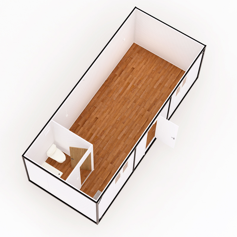 3. Yaşam Ünitesi (Studio): Bir köşede mutfak tezgahı, diğer köşede kompakt bir WC/Duş kabini ve orta alanda geniş bir yaşam/uyku alanı.