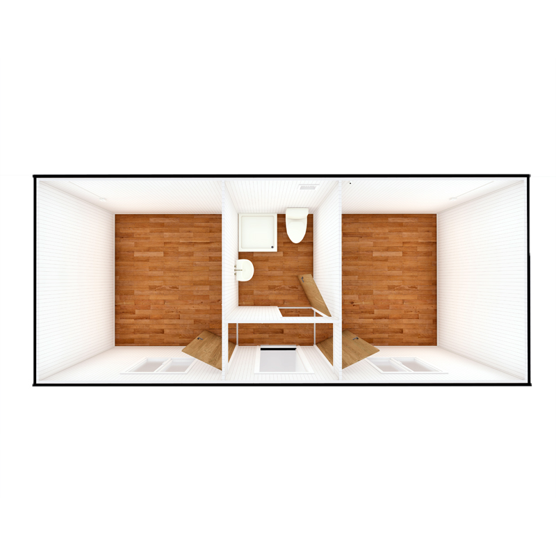 3. Yaşam Ünitesi (Studio): Bir köşede mutfak tezgahı, diğer köşede kompakt bir WC/Duş kabini ve orta alanda geniş bir yaşam/uyku alanı.